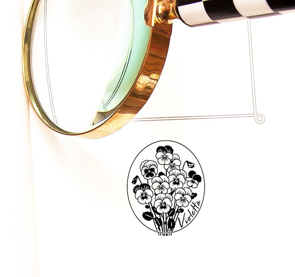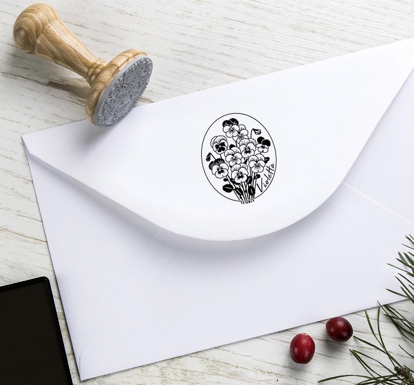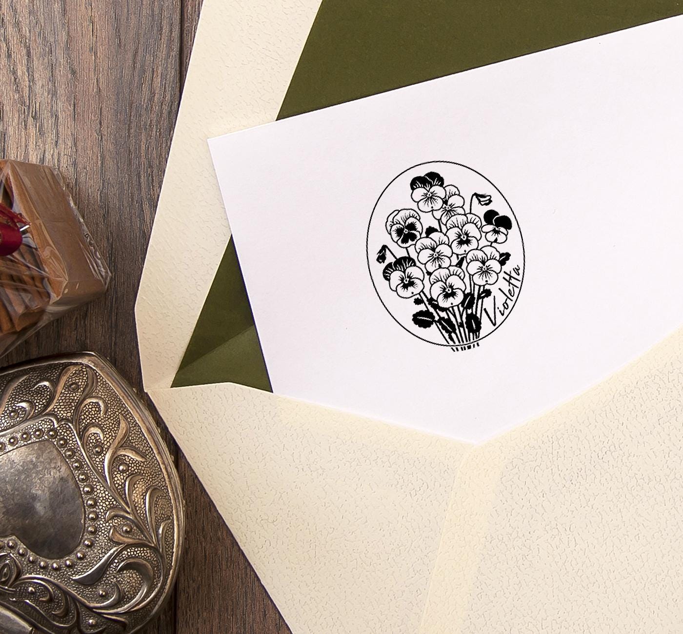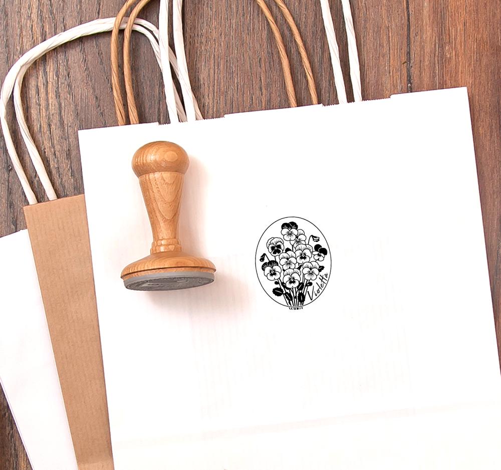 Personalized rubber stamp with a bouquet of Pansy flowers original design. It comes tied by ribbon in a special Gift Box and could be given as a present right away.