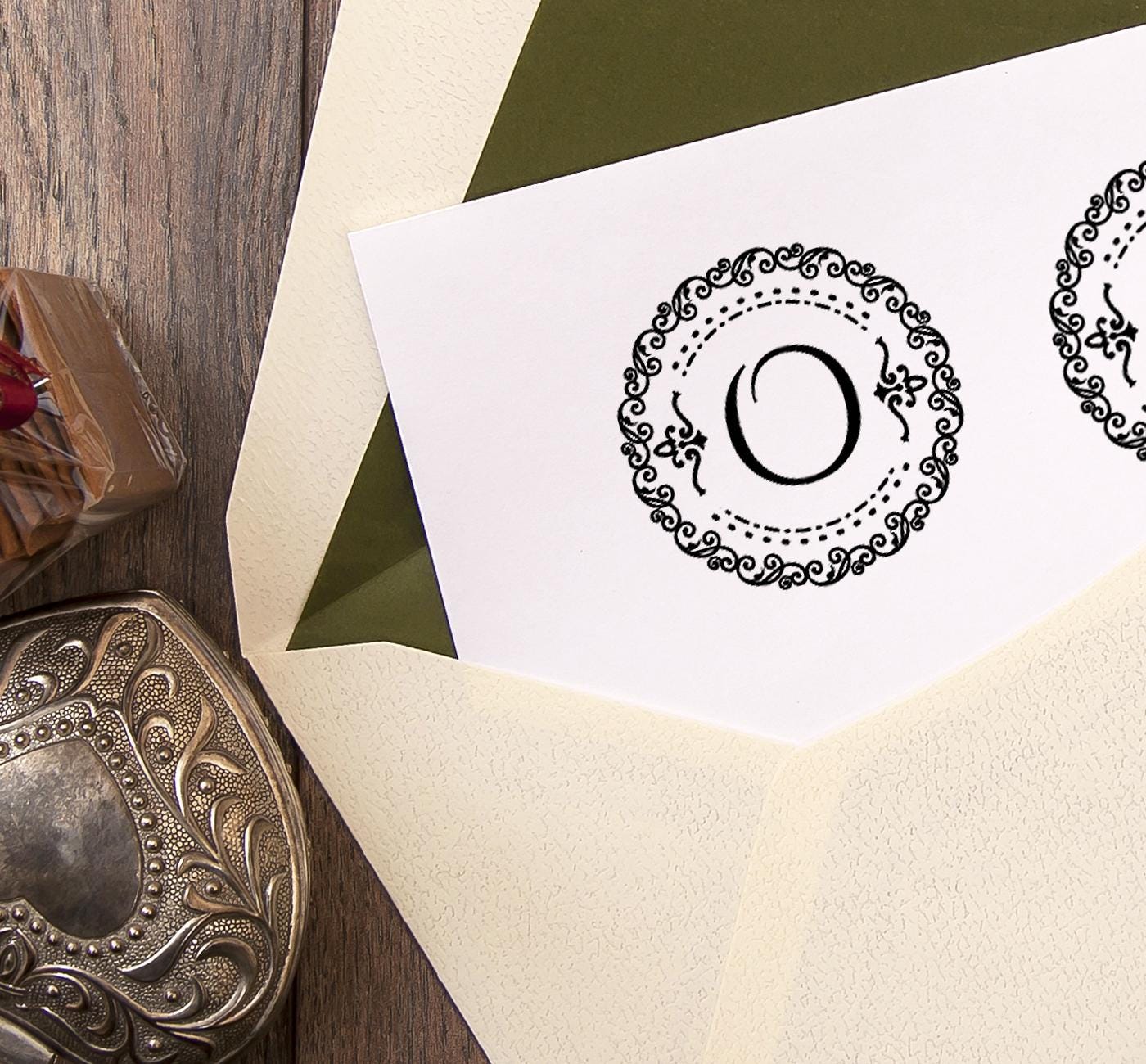 Name initial O with ornate border handmade wooden stamp. Comes tied by ribbon in a special design kraft paper gift box.