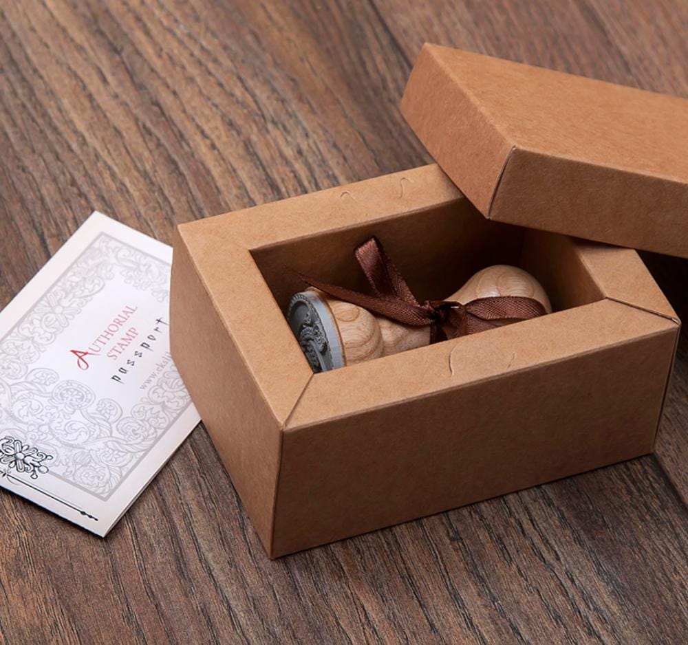 Name initial E with ornate border handmade wooden stamp. Comes tied by ribbon in a special design kraft paper gift box.