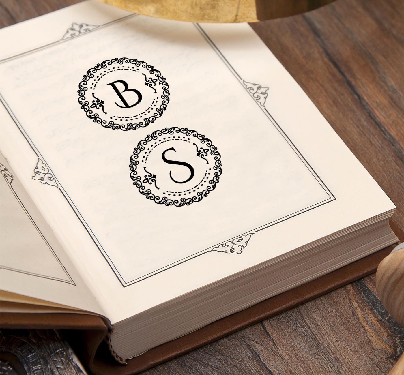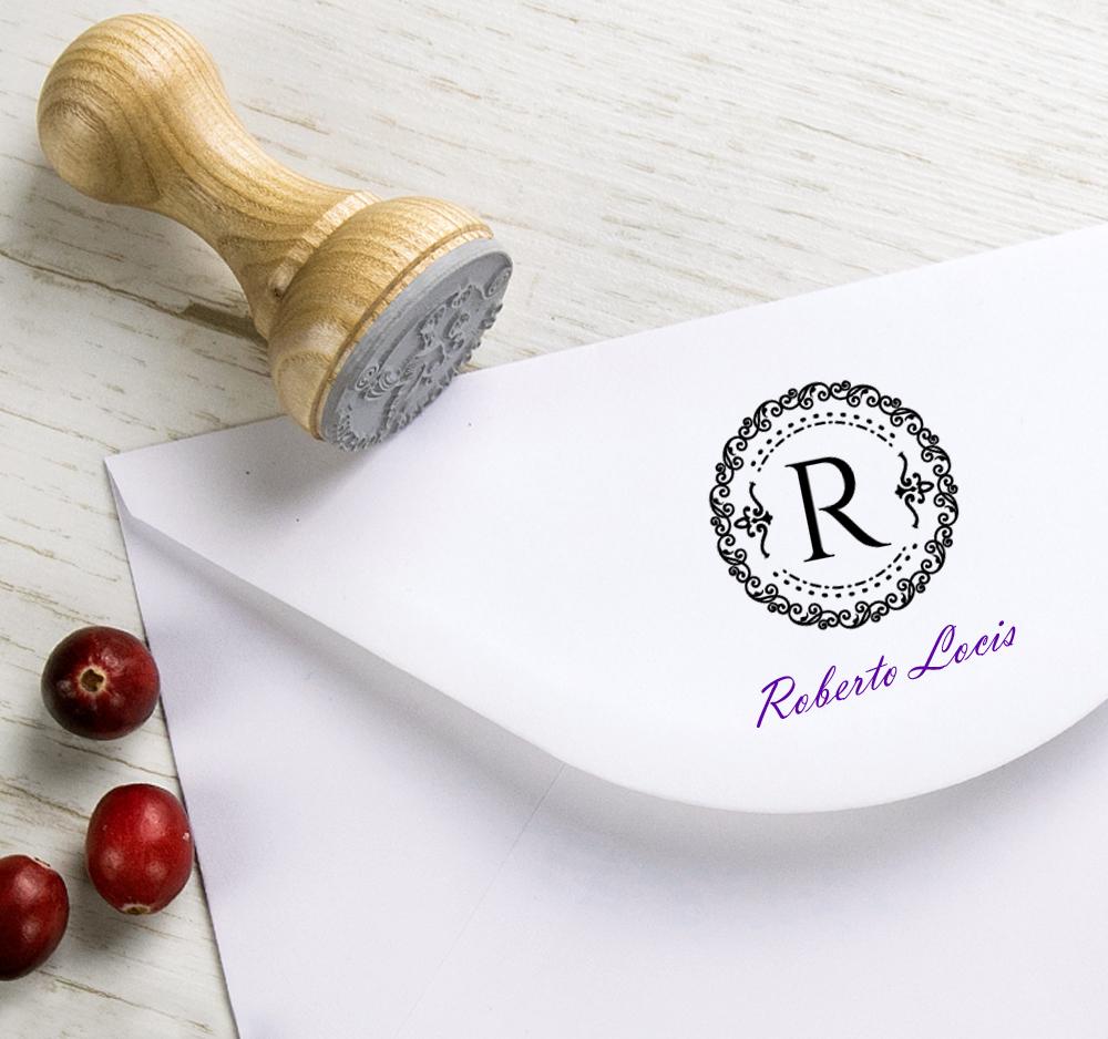 Name initial R with ornate border handmade wooden stamp. Comes tied by ribbon in a special design kraft paper gift box.