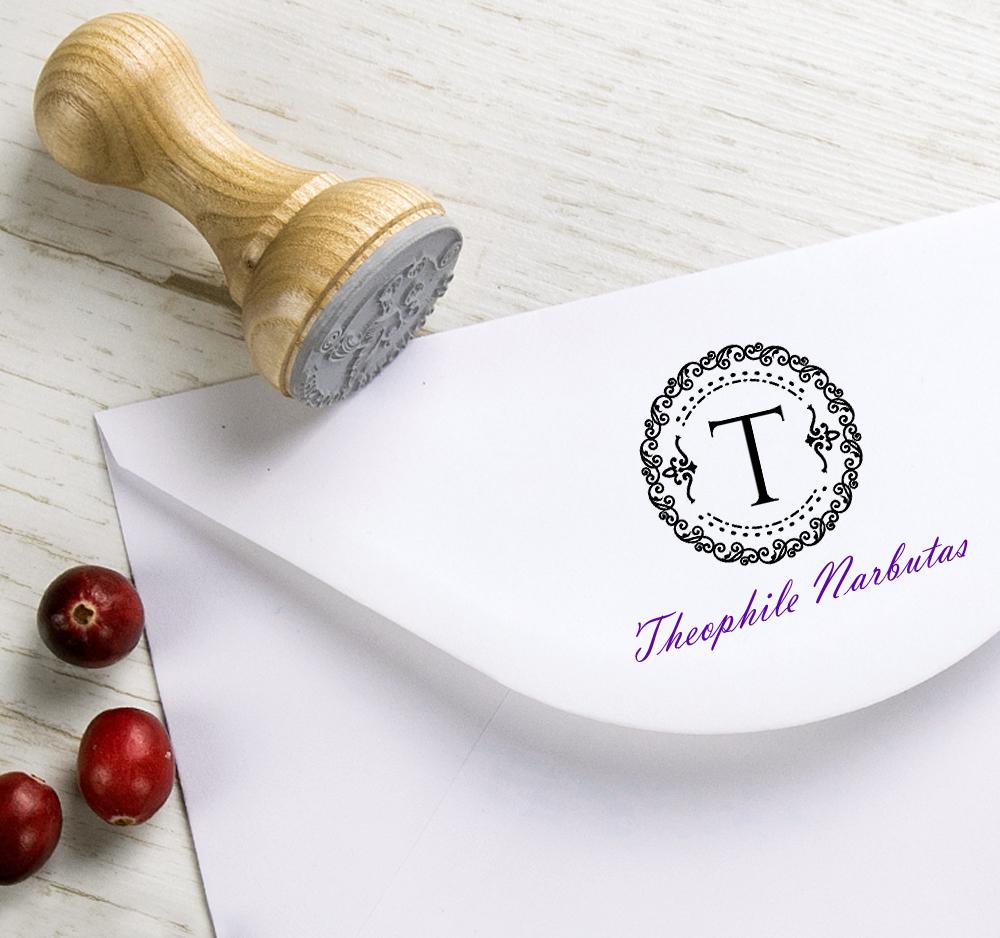 Name initial T with ornate border handmade wooden stamp. Comes tied by ribbon in a special design kraft paper gift box.