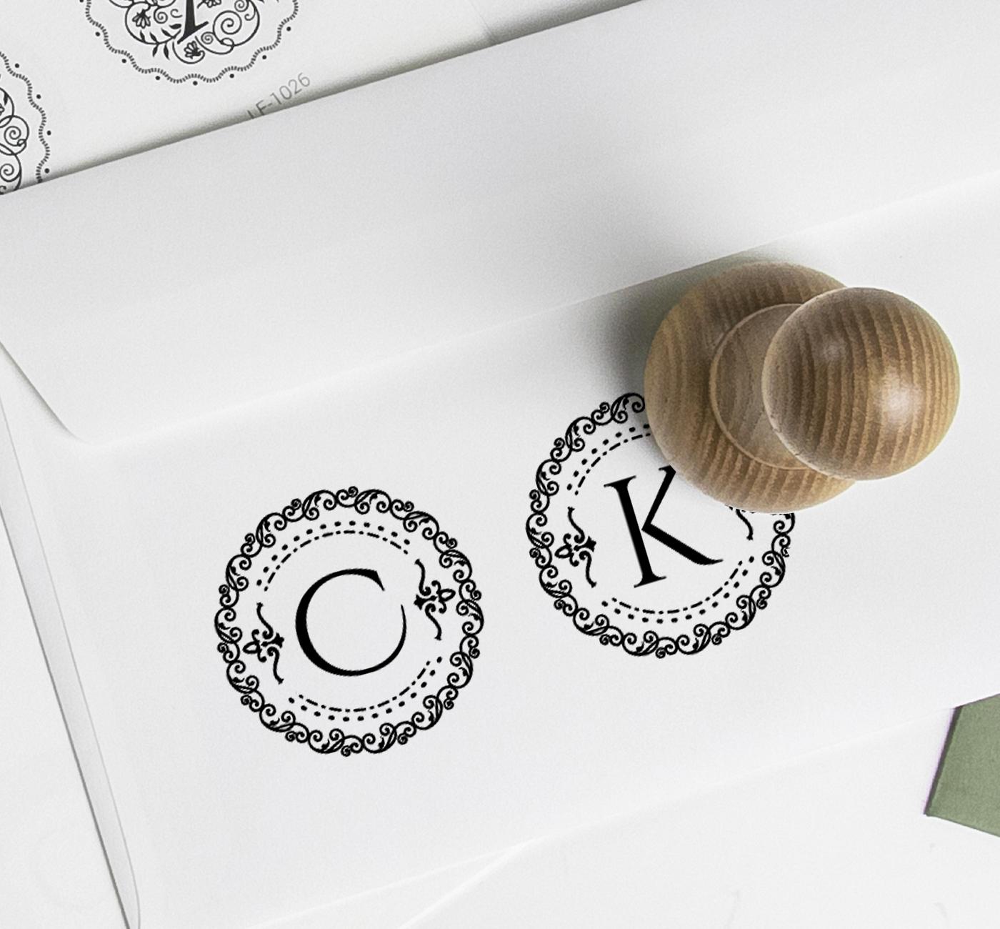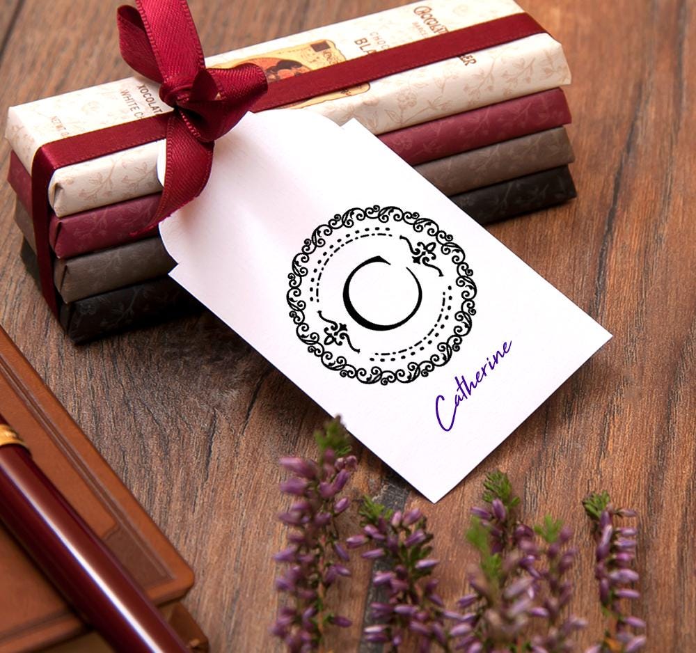Name initial C with ornate border handmade wooden stamp. Comes tied by ribbon in a special design kraft paper gift box.