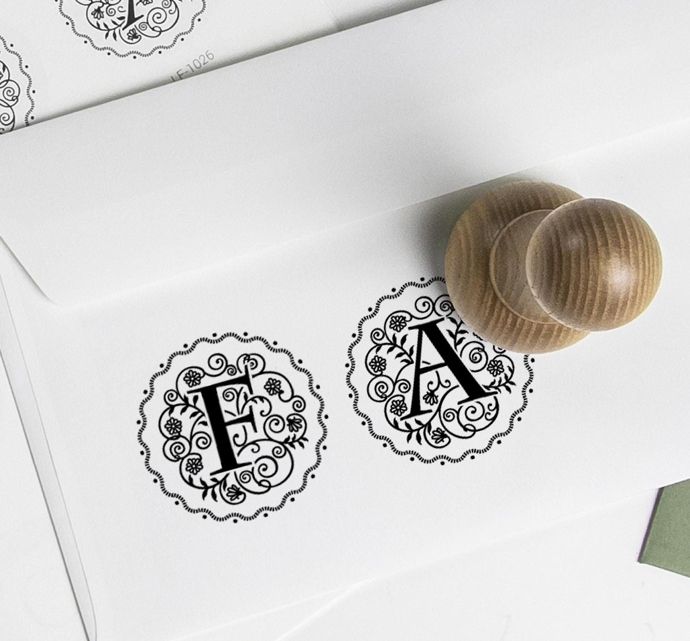 Floral design of a name initial F handmade wooden stamp. Comes tied by ribbon in a special design kraft paper gift box.