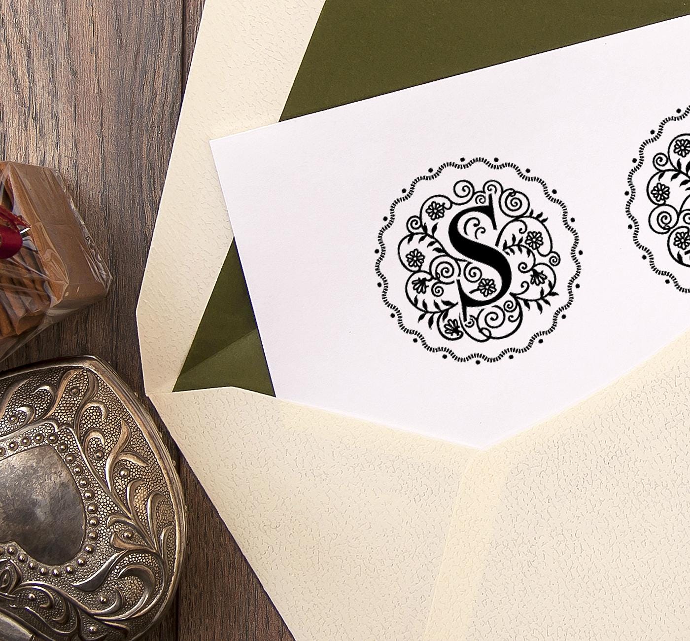 Floral design of a name initial S handmade wooden stamp. Comes tied by ribbon in a special design kraft paper gift box.