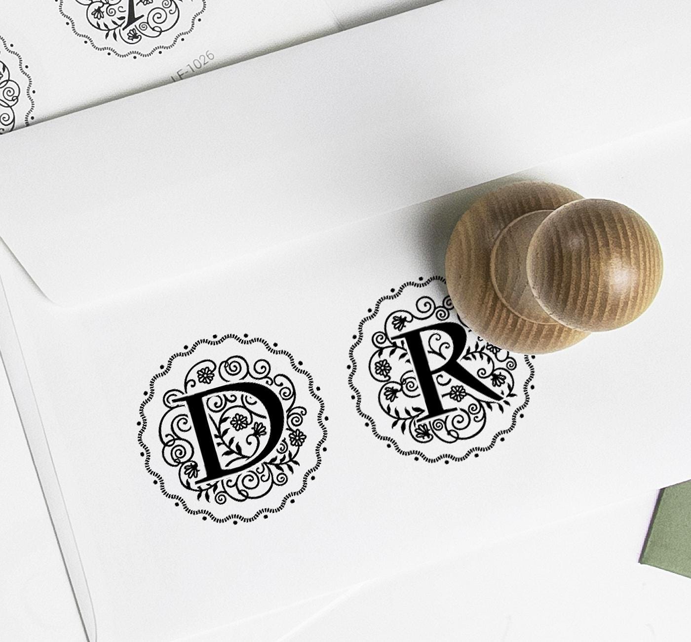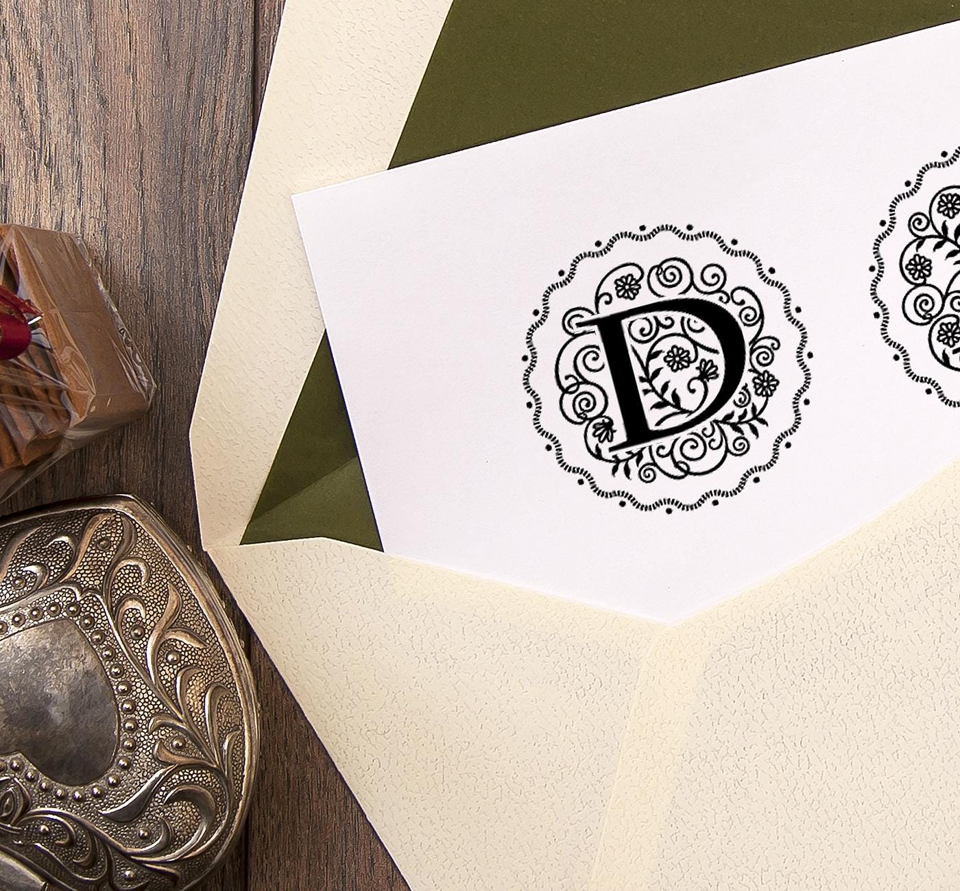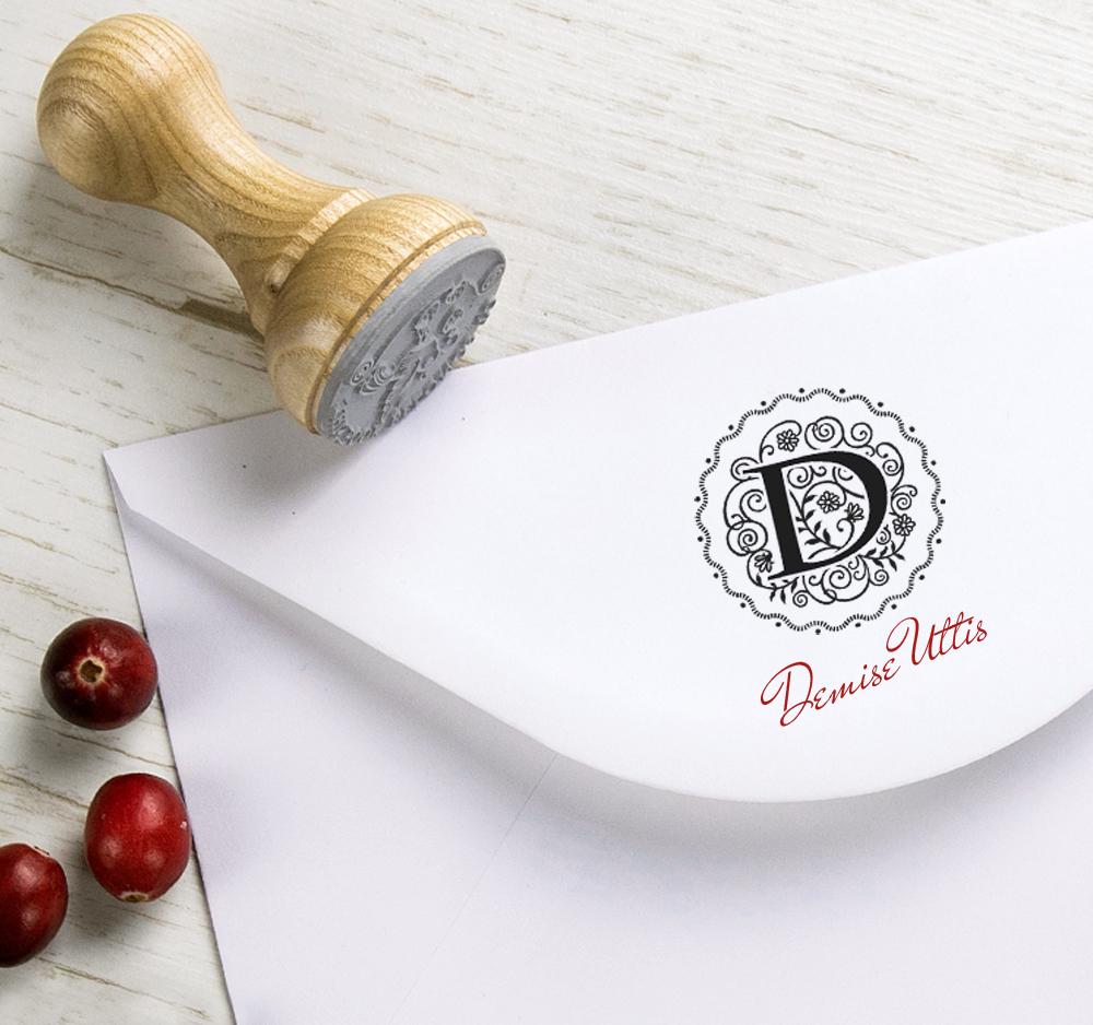 Floral design of a name monogram D, handmade wooden stamp. Comes tied by ribbon in a special design kraft paper gift box.
